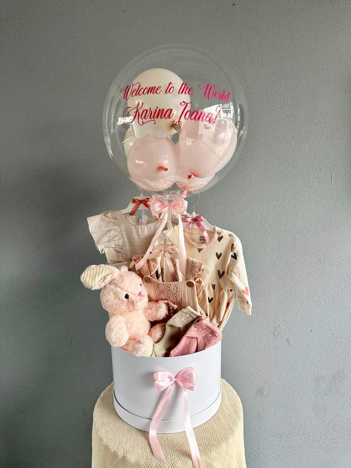 Cadou original pentru nou-născuți/ bebeluși/ copii. Hăinuțe delicate așezate într-un aranjament cu balon .