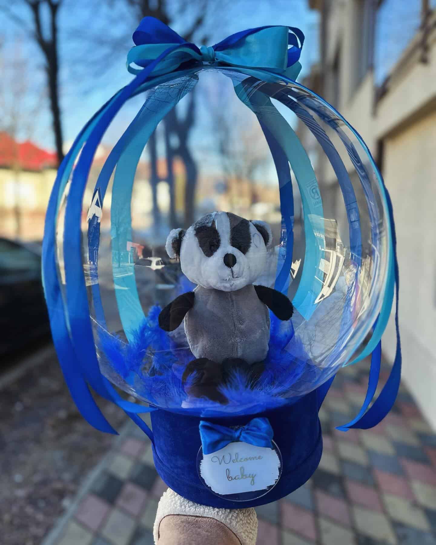 Ursuleț pufos și flori artificiale parfumate, prezentate într-un balon transparent elegant. Perfect pentru persoana dragă.