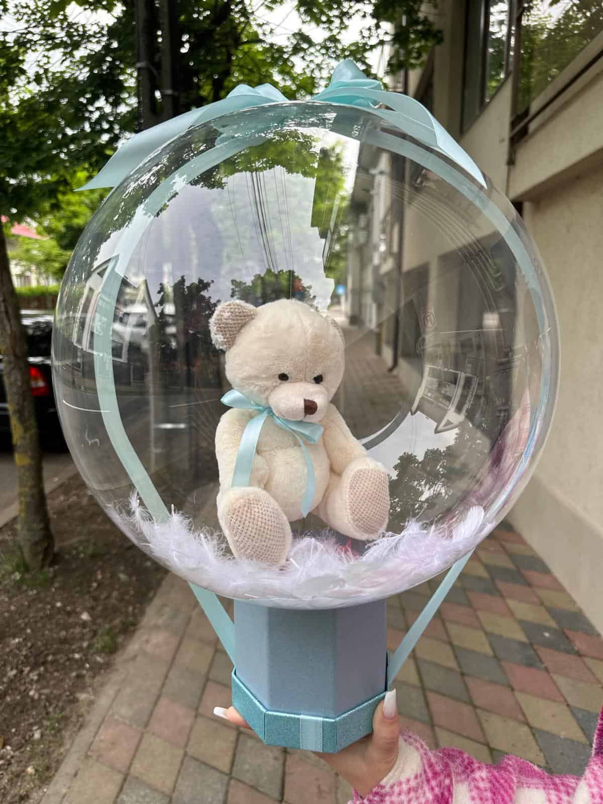 Ursuleț adorabil în balon transparent, înconjurat de flori de săpun. Un cadou plin de farmec și emoție.