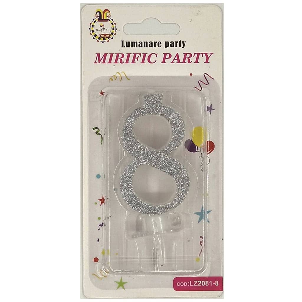 Lumânare tort argintiu cu sclipici 6cm cifra 8